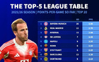 本赛季五大联赛场均积分:拜仁全胜第1,皇马、阿森纳二三位