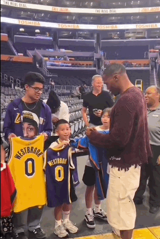 一群球迷等候威少在球衣上进行签名,当威少签了自己在雷霆时期的一些球衣之后,看到一位球迷拿着自己的湖人球衣,直接和这位球迷说道这件不会签,并询问了他是否还有其他球衣可签。最终,威少略过湖人球衣,只将其他球衣进行了签名。