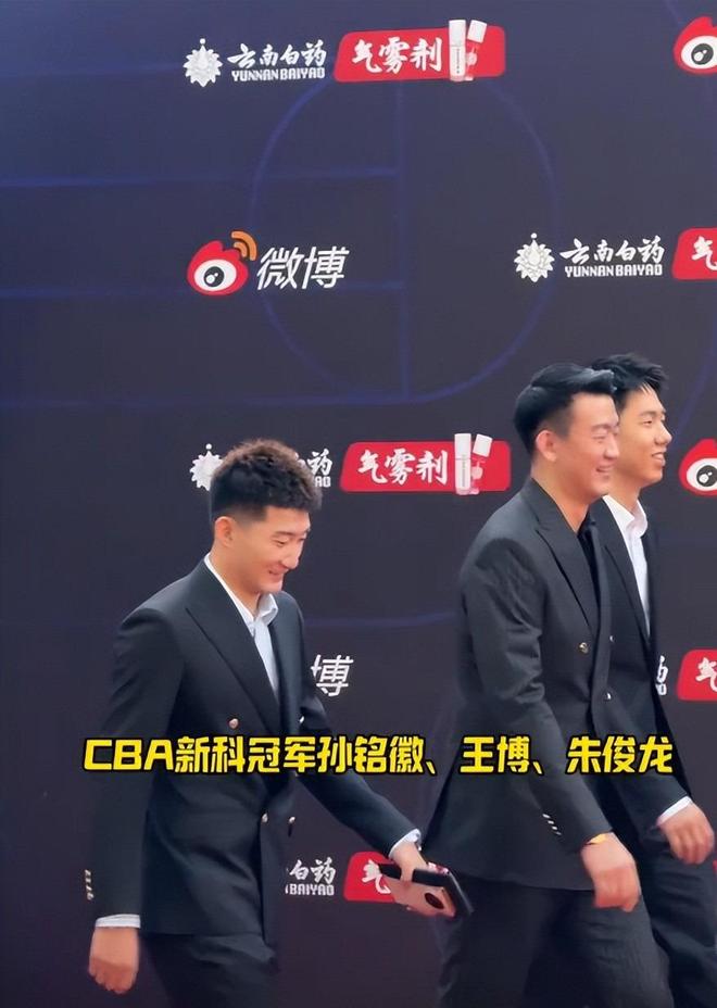 红毯开始,CBA新科总冠军孙铭徽、王博和朱俊龙结伴而行。