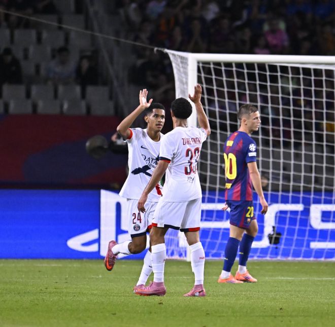 第24分钟,亚马尔中场被断,巴尔科拉反击机会处理不妥当让大巴黎错过扳平比分;第27分钟,马尤卢禁区前沿尝试远射高出了横梁;第30分钟,阿什拉夫任意球直接射门,什琴斯尼飞身将球扑出。逐渐打出攻势的大巴黎还是抓住了机会,第38分钟,门德斯左路发挥速度优势连过孔德和德、库巴西后横传助攻,马尤卢推射破门,1:1!第41分钟,巴尔科拉强突杀入禁区打门,皮球高出横梁,巴萨差点再丢一球。