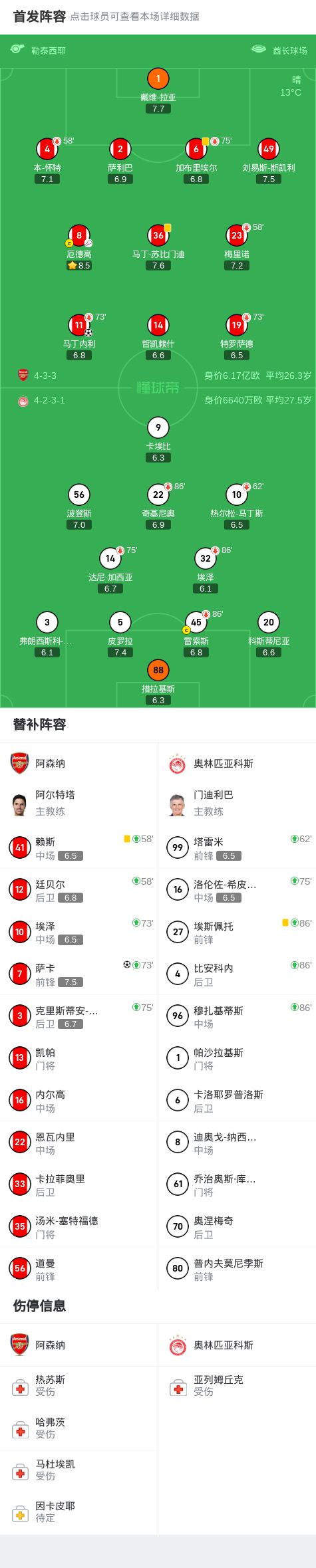 第13分钟,哲凯赖什打门中柱,马丁内利补射破门,阿森纳1-0领先
