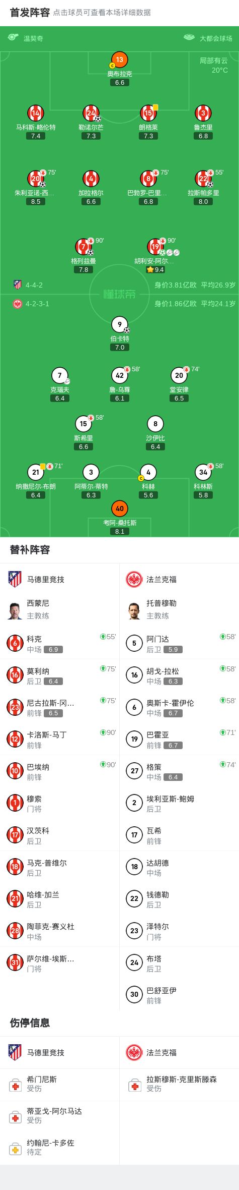 马竞5-1大胜法兰克福,胡利安-阿尔瓦雷斯2传1射,朱利亚诺-西蒙尼建功